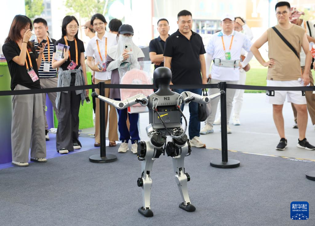 9月11日,参观者在体育服务专题展区观看人形机器人做广播体操。新华社记者 张晨霖 摄