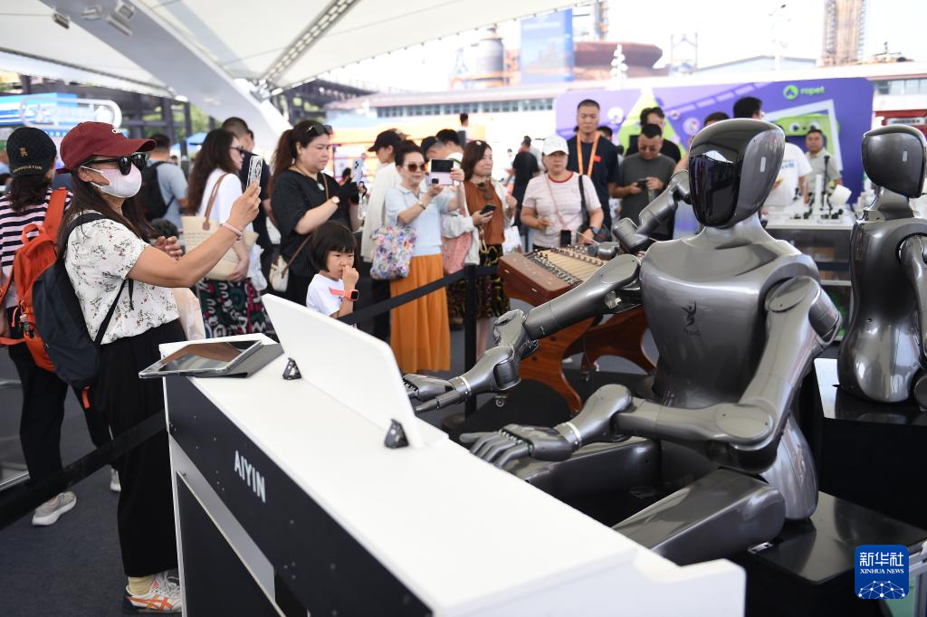9月11日,参展者在服贸会拍摄弹钢琴的人形机器人。新华社记者 刘岭逸 摄
