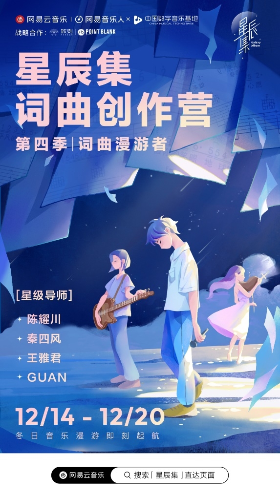 此前,网易云音乐星辰集线下创作营已连续举办三季,深受行业认可。作为国内领先的原创音乐平台,网易云音乐通过星辰集、石头计划、硬地围炉夜、硬地原创音乐榜等多项举措持续助推中国原创音乐发展。而星辰集线下创作营通过专业的词、曲、编课程,金牌团队制作、自由组队创作等形式,帮助学员打造代表作,助力优秀的词曲作者“出圈”。