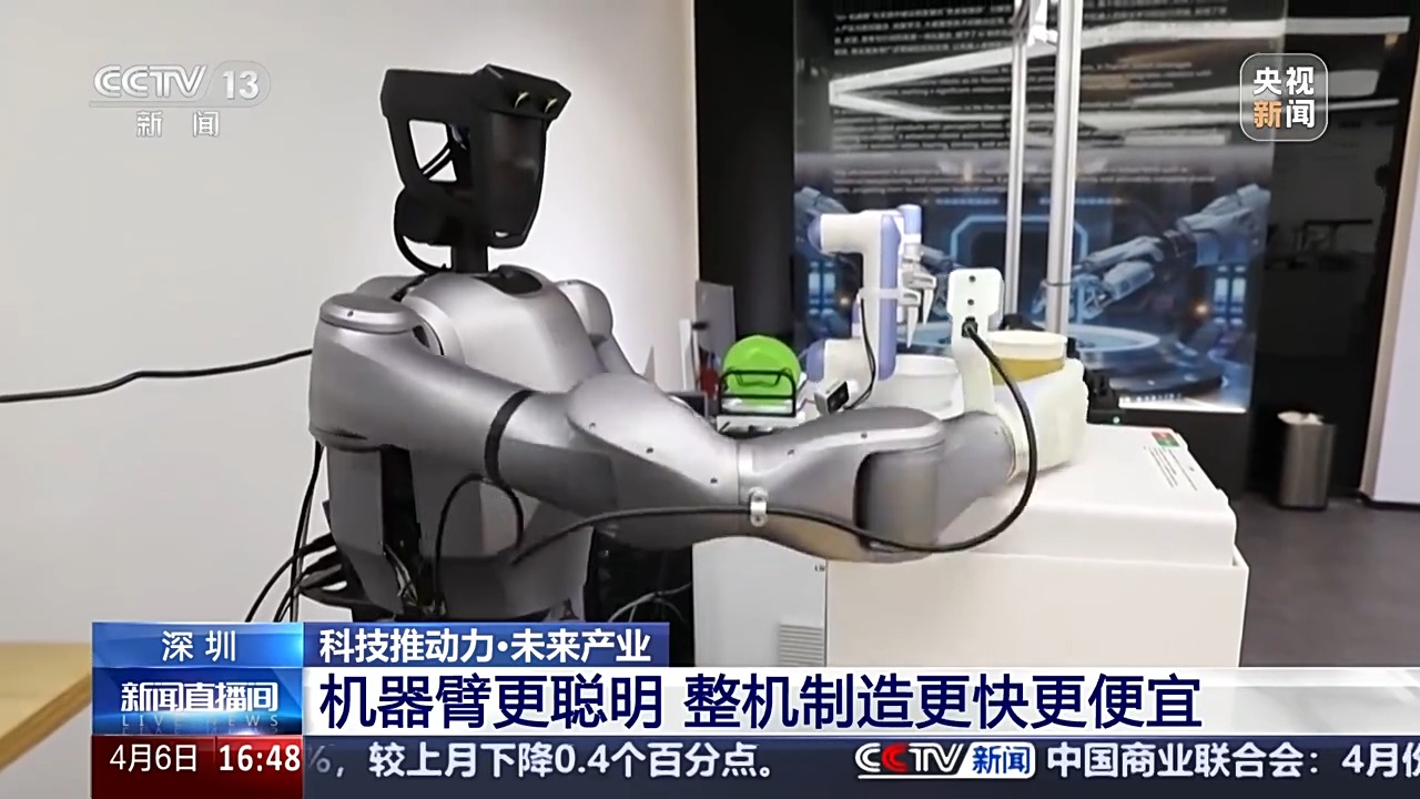 在深圳,围绕具身智能产业,关键零部件的创新和升级正在加速。记者来到深圳的一家协作机器人制造企业,他们生产的以机器臂为代表的协作机器人,已经在全球出货量累计超80000台,占据出口行业第一。一走进公司展厅,一个全新升级的具身智能机器人,就为我们表演了全套的迎宾工作,泡茶、递水,展示了机械臂精准操控与智能的结合。在另外一个实验室,记者还亲自体验了和机器人一起维修机器人。