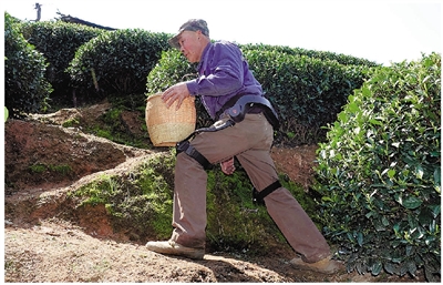 外骨骼设备助茶农轻松上山。记者 李忠 摄