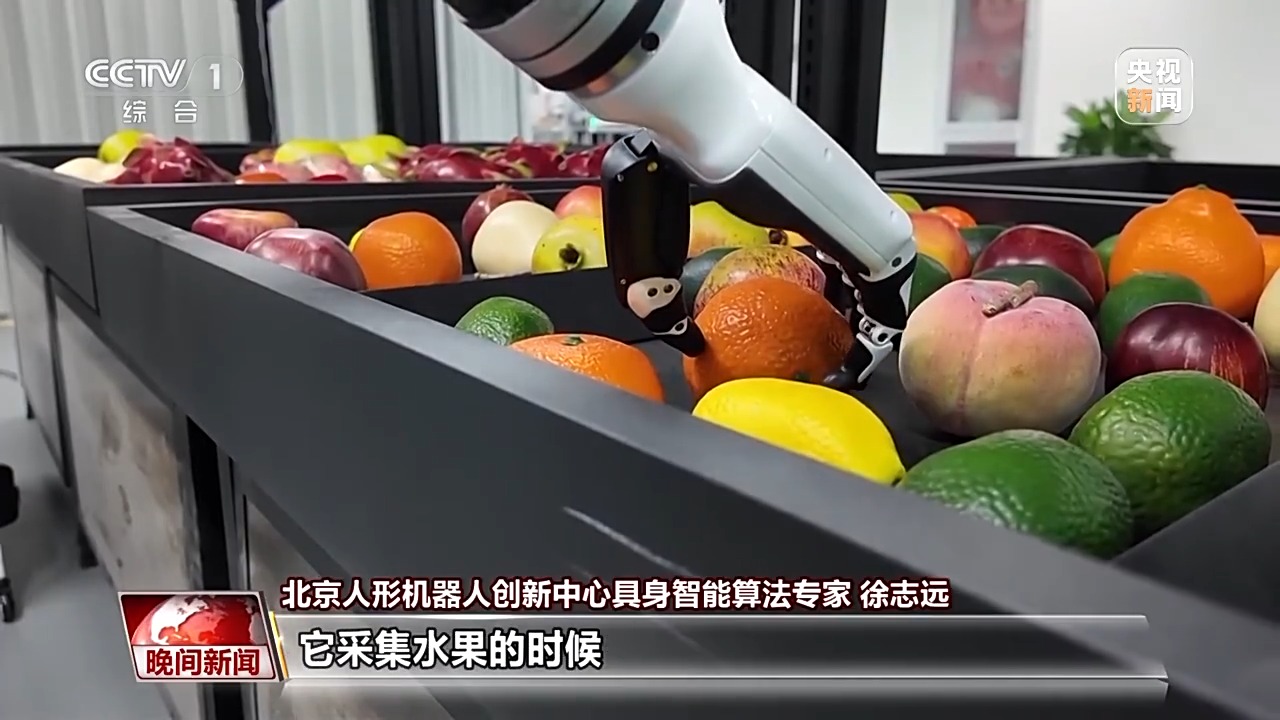 北京人形机器人创新中心具身智能算法专家 徐志远:比如说在商超场景里面,它采集水果的时候,有的时候他相当于离这个篮子还比较高的时候就放下去了,这个时候如果它是一个真实的水果,可能会被砸坏。像这种工业环境,我们其实是希望它能够速度更快一些,因为在工厂里面大家节奏都很快。