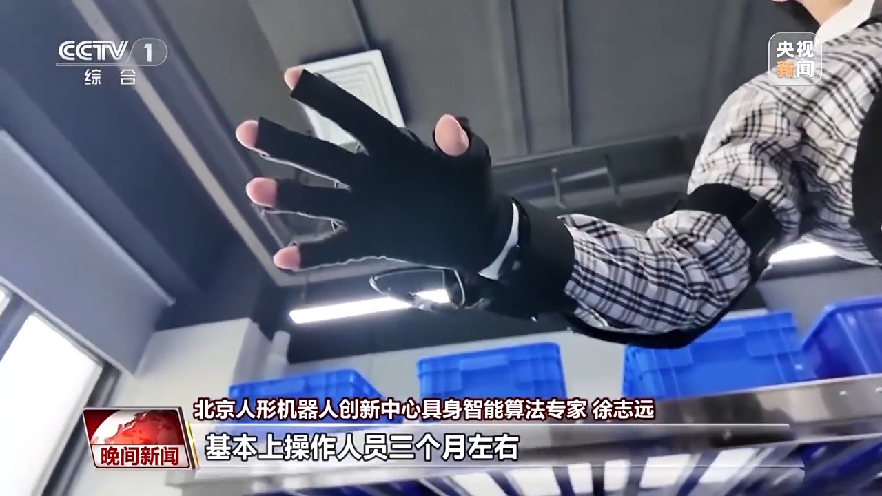 北京人形机器人创新中心具身智能算法专家 徐志远:比如说,从这个货架上抓到箱子里面,它其实算是一次轨迹动作,像这样的轨迹动作,每天不同的任务会重复大概100到150次左右,基本上操作人员三个月左右会达到一个非常熟练的水平。