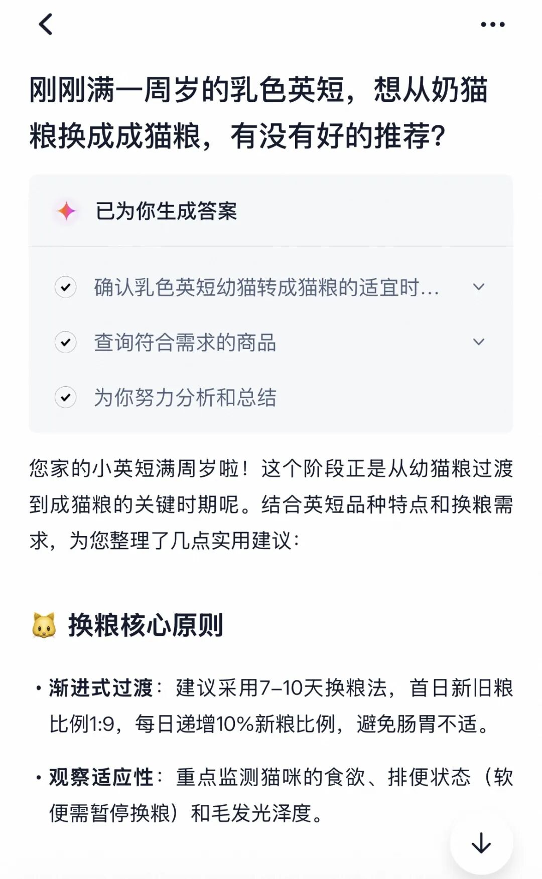 一两秒钟的功夫AI生成了一份结果,或者准确地说是一份购物攻略,里面包含了换粮核心原则、成猫粮推荐方向、注意事项、操作建议等。比如成猫粮推荐方向按英短专用配方、高蛋白低敏粮、功能性选择三个角度进行了推荐,并显示推荐商品的特点。点击蓝色字体,就可以直接进入商品页面。