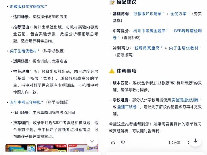 针对数学教辅推荐,最让我满意的是,在系统自主框定了浙教版的范围后,又根据实际场景进行了细分化的推荐。比如基础比较弱的小朋友,AI推荐的是浙教版知识清单;针对中等生提分与题型突破,推荐的是杭州中考黄金题库;针对冲刺高分与竞赛拓展,推荐了钱塘甬真重高。