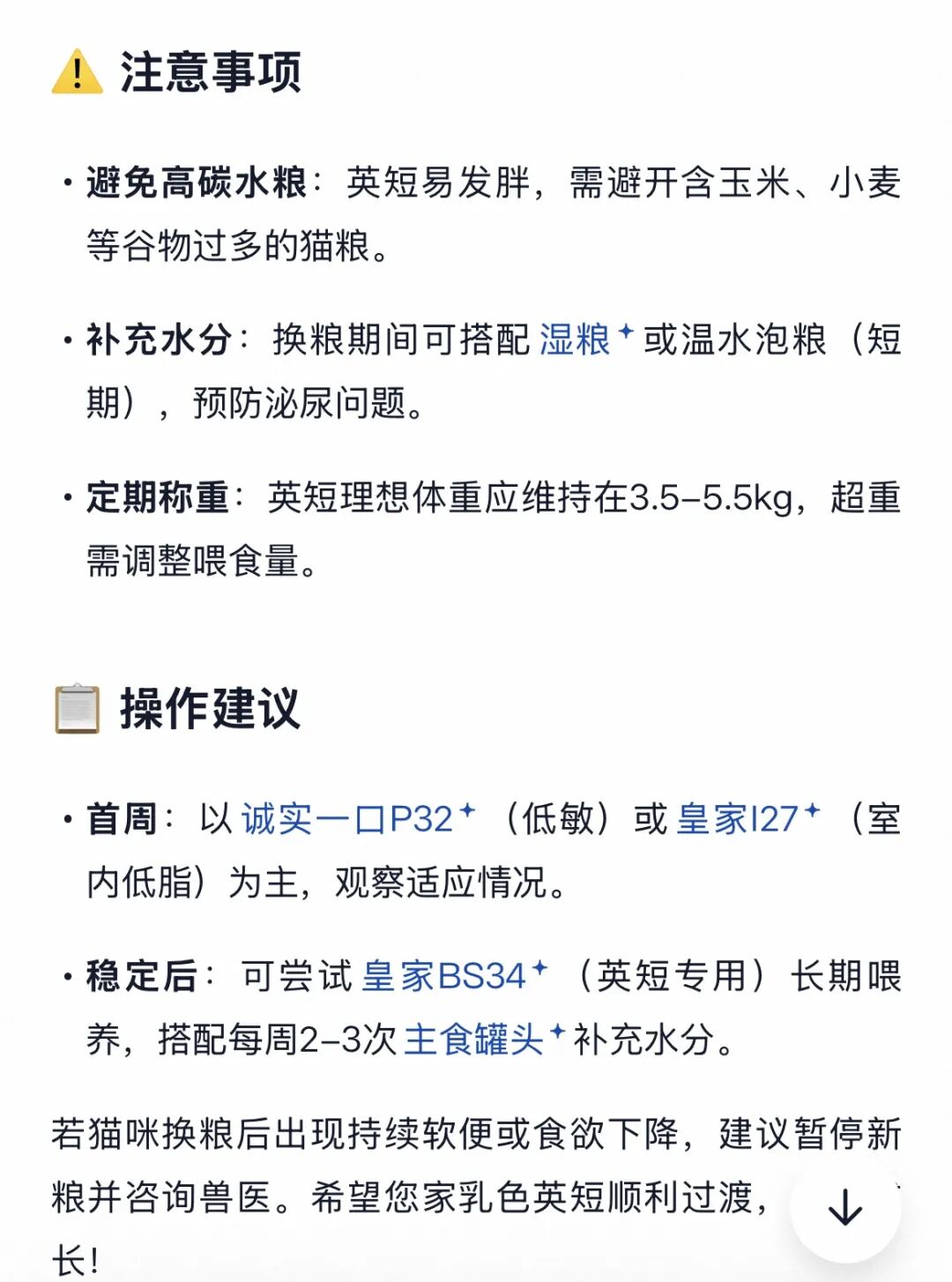 在操作建议里,AI建议我第一周以低敏或室内低脂为主的猫粮,观察适应情况,待稳定后,再尝试英短专用长期喂养,并搭配每周2-3次主食罐头补充水分。