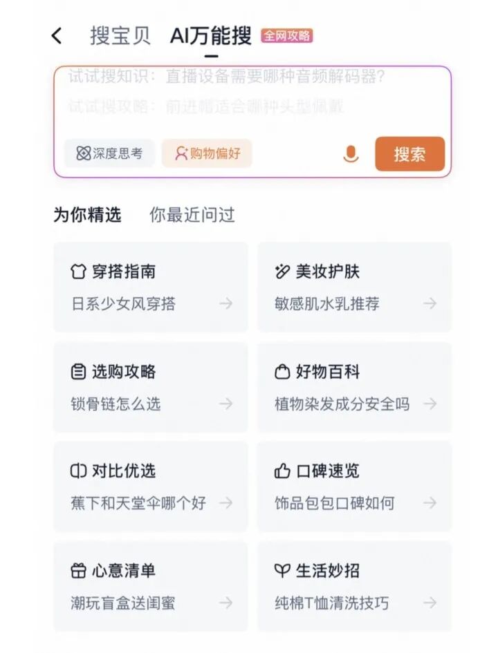 AI万能搜定位为一款深度思考的搜索产品,目前在手机淘宝首页点击搜索框,就能切换至入口。