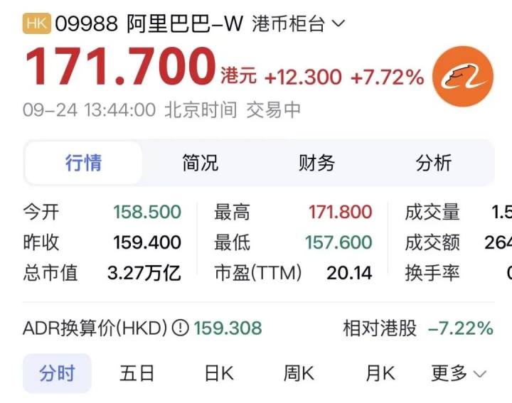 随着上午阿里超大规模集群、高密度AI服务器和新一代网络架构的曝光,今天,阿里巴巴股价持续大涨,港股股价创下2021年10月以来新高。截至发稿前,涨幅达到12.4%,总市值超过3.28万亿港币。