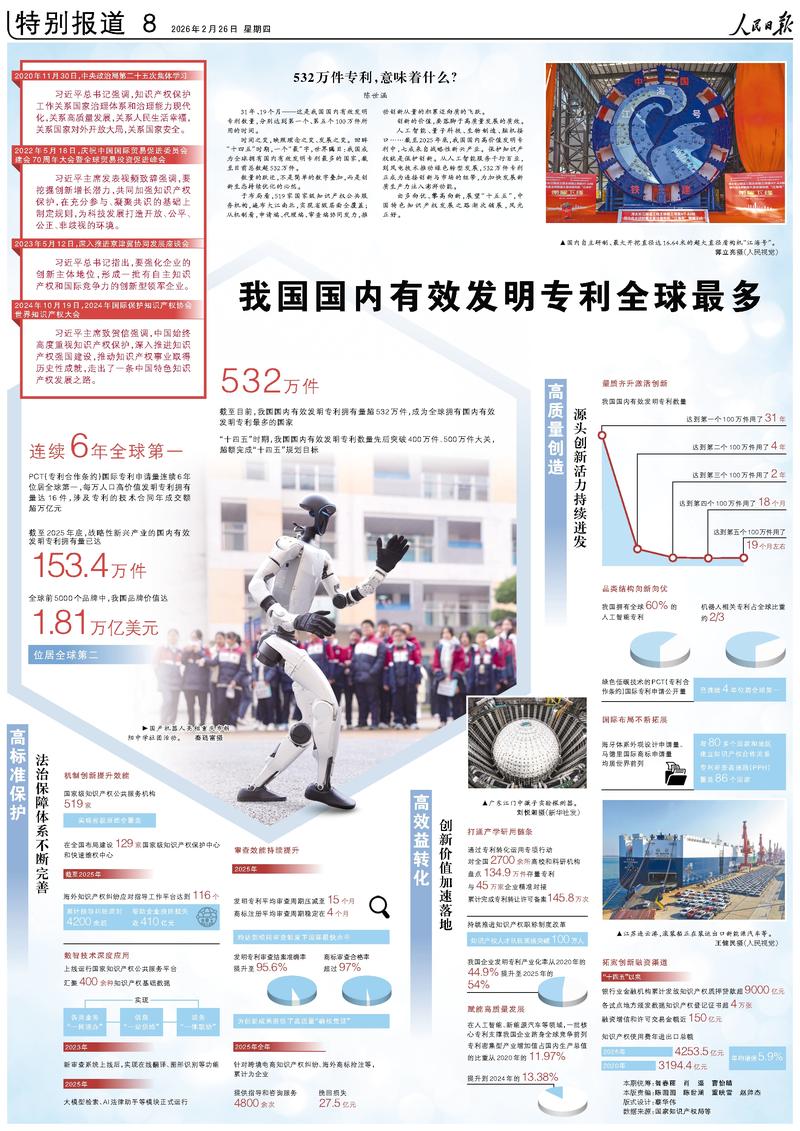 人民日报北京2月25日电 国家知识产权局数据显示:我国国内有效发明专利达532万件,成为世界上首个国内有效发明专利数量突破500万件的国家。“十四五”时期,我国国内有效发明专利数量持续增长,每万人口高价值发明专利拥有量达16件。截至2025年,我国发明专利申请量已连续多年位居全球第一,成为名副其实的专利大国。